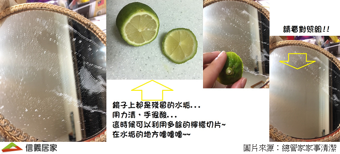 水垢讓鏡子看起來霧霧髒髒的,但有時候用力刷洗,還不一定可以刷得掉。其實,只要用檸檬切片擦拭鏡面,用水沖洗後、再用乾布擦拭,鏡子就找回它的春天了。如果手邊沒有檸檬,也可以用沾了醋的海綿代替。