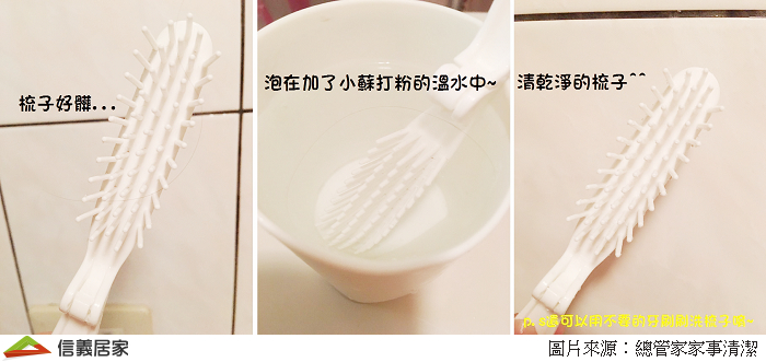 梳子用久了因為沾上皮脂跟灰塵,齒縫都會黑黑的、看起來相當噁心。這時候,只要準備溫水1公升跟小蘇打粉2匙,調勻後把梳子放入浸泡數小時,再用清水沖洗乾淨並晾乾,齒縫就乾淨溜溜囉。