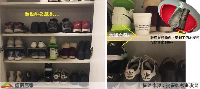 經常穿的鞋子,難免會因為腳汗而產生異味,導致鞋櫃臭氣熏天。建議您,每個月可以用醋水擦拭鞋櫃來抗菌除臭,平常也可以在鞋櫃中放一些小蘇打粉或木炭,雙管齊下、就能有效地去除異味兼發霉。小技巧:將小蘇打粉放在衣櫃裡也可以除臭跟防霉喔。
