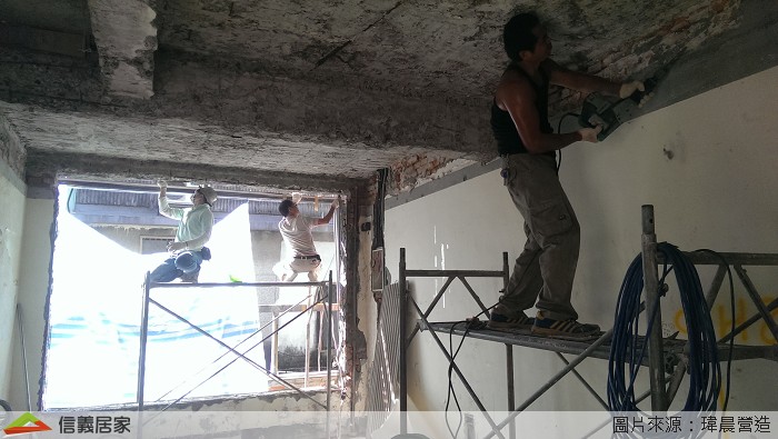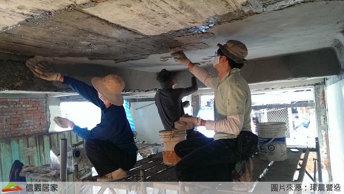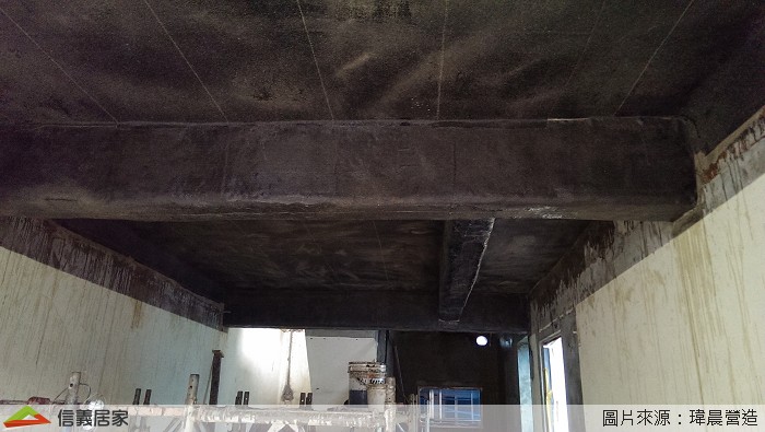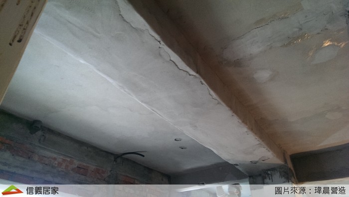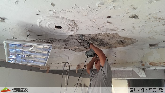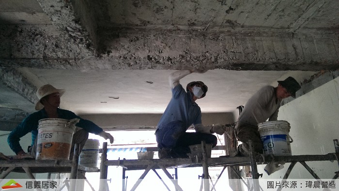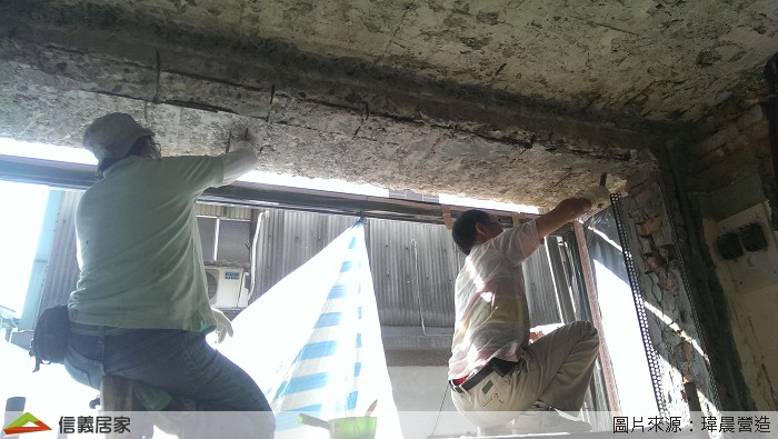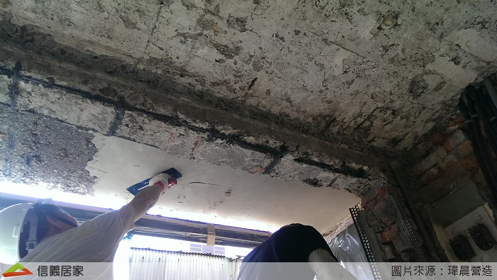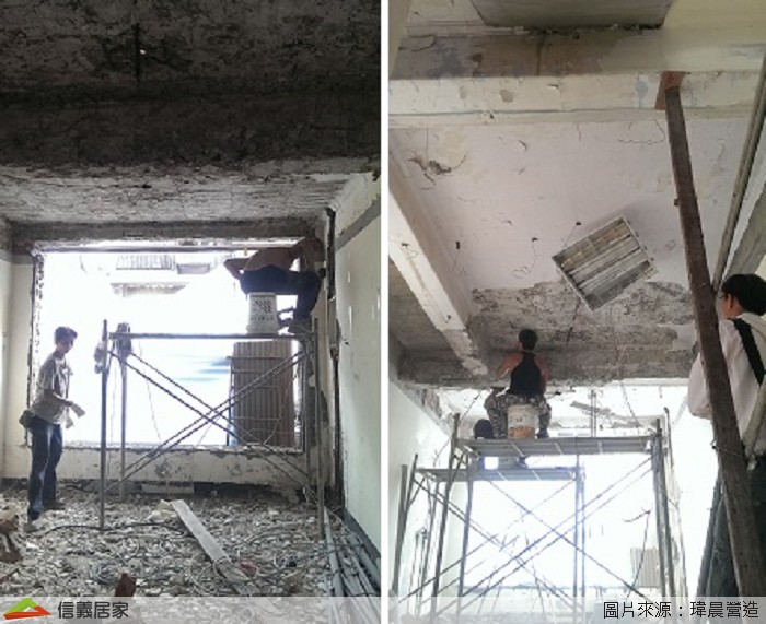 先將天花板及樑體上剝落的混凝土通通打除乾淨,光這個步驟就花了10個工次,但就像前面說的,萬事起頭難,但只要前面的步驟做好,後面的工作就輕鬆很多了!