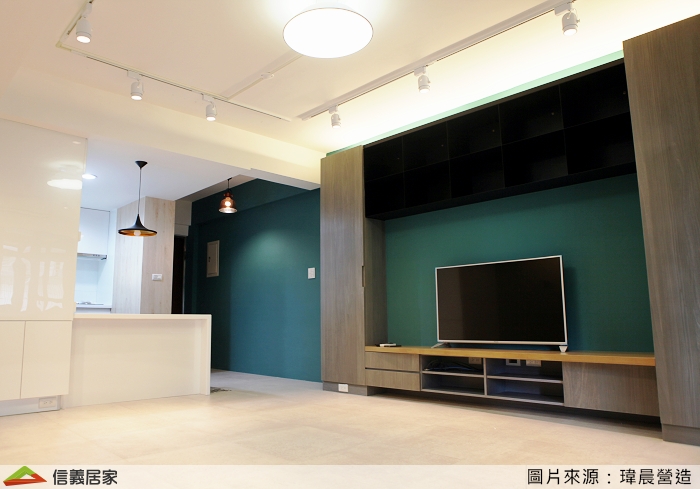 ▲電視主牆用孔雀綠搭配鐵灰木皮電視櫃,櫃體上方設置烤漆鐵件吊櫃增加收納空間。