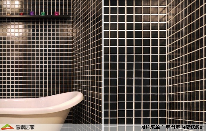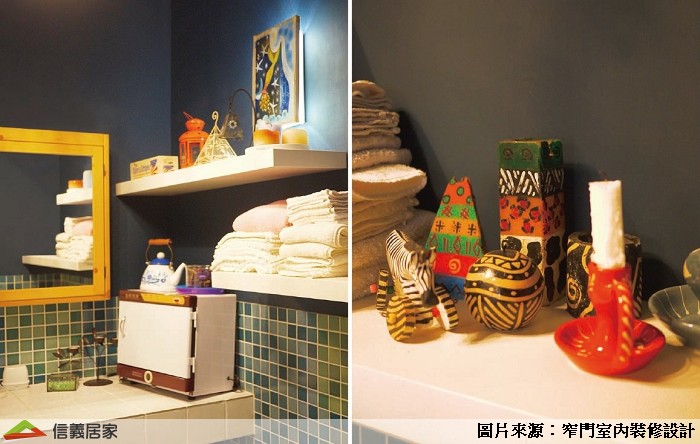 ▲浴室色彩以深色為基調,牆面上方採沈穩的深藍色粉光油漆,牆面下方採深淺交錯的馬賽克磁磚,鏡子邊框用韻味質樸的木料,搭配女主人從國外收集的藝術飾品點綴,讓人感受舒適寧靜的浴室空間,與豐富的情感氛圍。