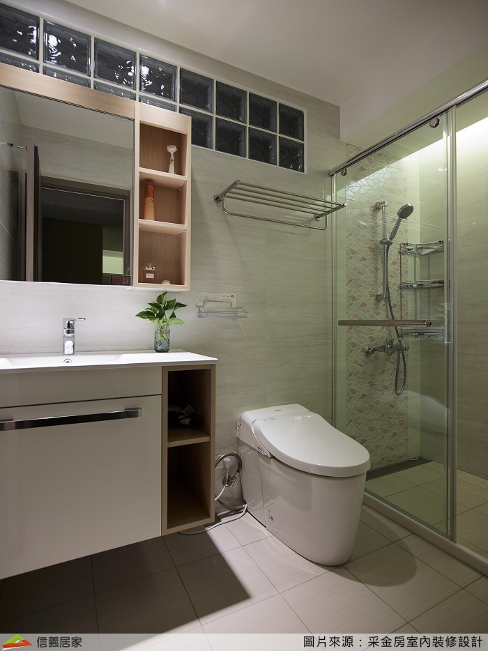 ▲浴室壁磚與客廳、臥房相呼應,加強整體美感;上方玻璃磚讓衛浴空間維持空間通透性且不死板。