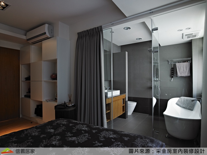 ▲將衛浴空間的整片牆與門板都改為全透明的玻璃門,帶來入住精品飯店一般的體驗,想保有隱私時替落地玻璃拉上浴簾即可。