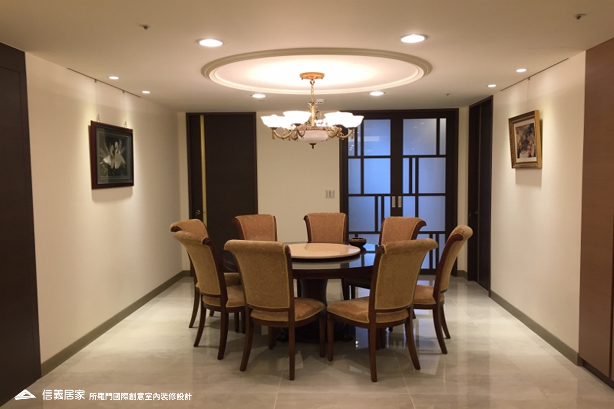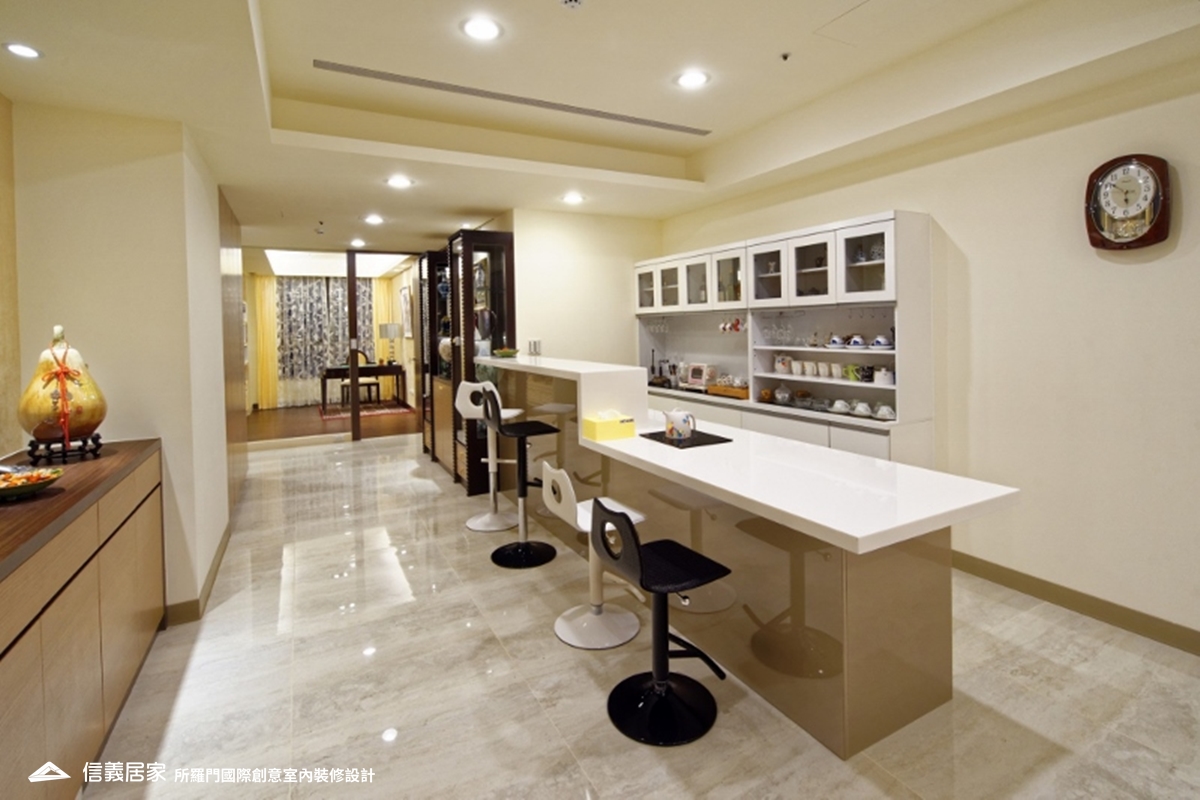 整體設計走簡約路線,設計師融入屋主非常喜歡的金色元素,並選用仿大理石紋的大尺寸瓷磚所拼成的電視牆面,在簡約中流露出奢華感。在公共和私人區域間設置了餐廳、大吧檯和展示櫃,讓屋主能在此展現煮咖啡的好手藝來接待貴賓外;放上琉璃、瓷器和馬克杯等收藏品,搖身一變成為展示區。公共區域的地面採用仿潑墨石紋的地磚,不論視覺或是使用上,都不會讓人覺得空間被刻意區劃開來;不間斷的空間延伸,也讓大坪數的尺度更為大器。