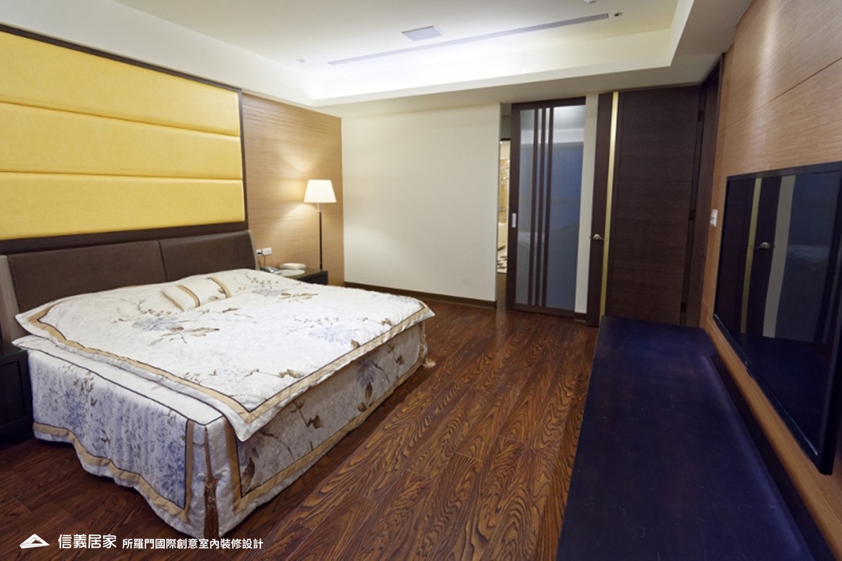 主臥房床頭裱布選用屋主喜愛的金色,而門片、立燈等也以金色局部點綴,讓床頭不會太過搶眼,使整體視覺更為契合。