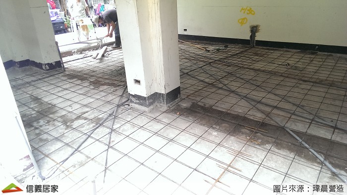 地坪整平如果直接鋪上水泥或混凝土,很容易會造成龜裂破損的情形。所以我們要先把素地整理乾淨之後再鋪上點焊鋼絲網(照片中一格一格的就是了),增加混凝土的握裹力,就可以減少龜裂破損的情況。清潔的步驟非常重要,泥作工程前一定要把施作處清潔乾淨施作效果才會好喔!