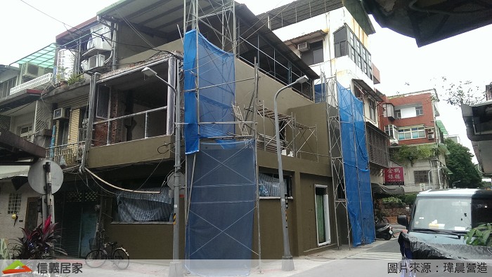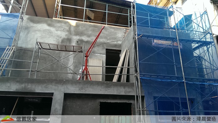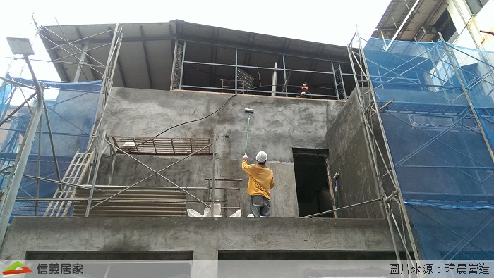 因為本案有外牆的泥作工項需要爬高爬低,師傅的施工安全一定要非常注意,所以要先搭好鷹架,這樣工作時才沒有後顧之憂喔。鷹架完成後開始工作了。