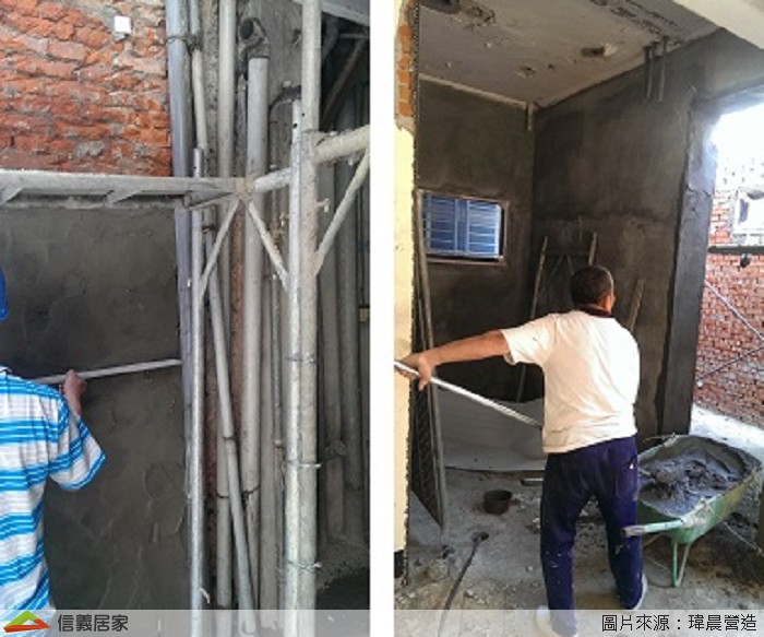 接下來就是牆面水泥打底,將水泥漿塗布在磚牆上,塗佈完成後牆面需平整。等到內外牆面都打底完成後,就開始在外牆及廁所的內牆上塗佈防水塗料。