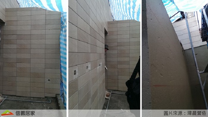 本案我們選用的外牆磚是黃山石的板岩磚,因為有不同的顏色搭配,讓外牆看起來活潑許多,選擇日後好清理的米黃色搭配淺灰色的洗石子讓外觀更豐富。雖然施工時碰到梅雨季,但是為了工程進度考量,我們還是搭起帆布努力趕工。