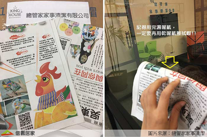 因為報紙中的油墨能夠完整吸附髒汙,將報紙沾水後輕輕擦拭窗戶玻璃,就可以輕輕鬆鬆地把髒污清除乾淨;用濕報紙擦完後,一定要用乾報紙再擦拭一次,玻璃才會乾淨。