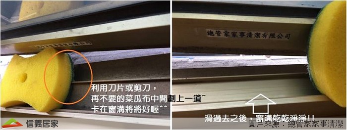 在舊的海綿上用刀片劃上幾道刀痕,因為柔軟的海綿可與窗溝槽吻合,清潔時只要前後刷動,就連吸塵器和抹布無法去除的污垢,也會一乾二淨囉!PS. 記得選用海綿柔軟的那面,或是使用不會刮傷窗溝的菜瓜布。