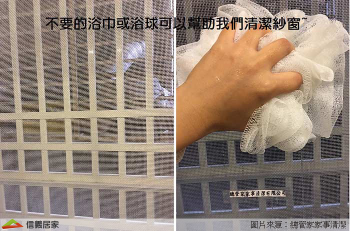 你可知道,用來洗身體的沐浴巾或沐浴球,它們清除灰塵的效果超級驚人!因為它們和紗窗的材質類似,摩擦時較不易沾黏灰塵,只要在清潔後用吸塵器將掉入溝槽的灰塵吸乾淨即可。PS.清潔時記得要關上窗戶,避免灰塵掉進屋內。