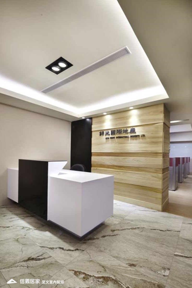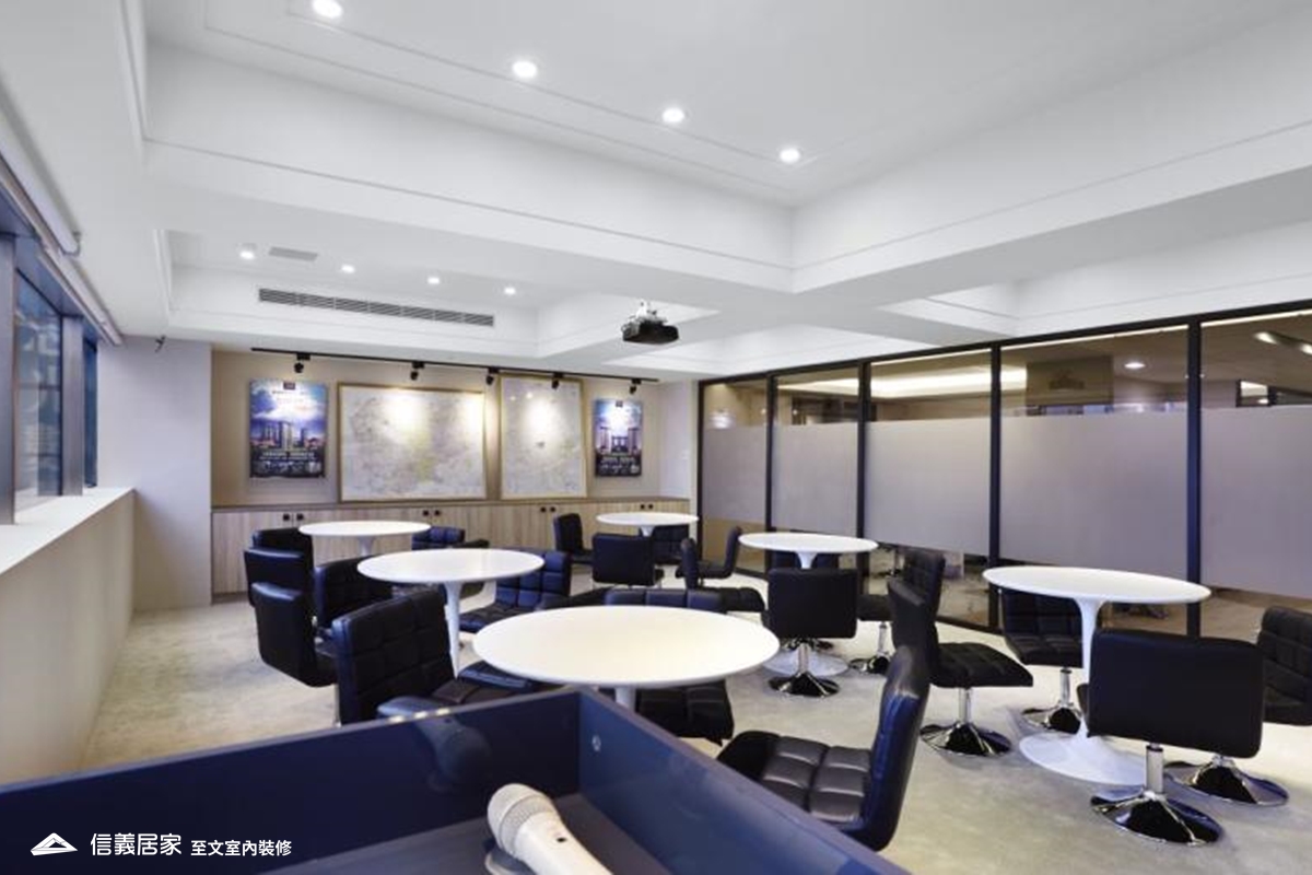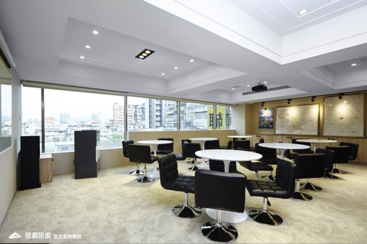 業主帶領著地產團隊在海外打拼的同時,也希望在台灣的同事們能有好的工作環境;藉由朋友的引薦找到了至文團隊,希望打造出家的感受、讓員工放鬆工作。因應地產公司所需要的開放辦公空間、及私人會談空間,打造出lobby櫃檯區、視聽室、會議區、茶水區、辦公區、資料庫、休憩區。
