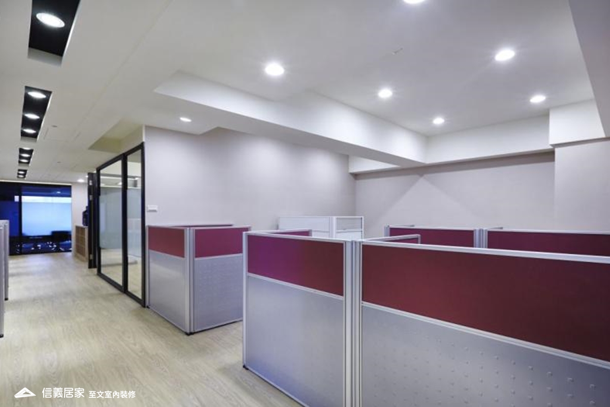 因辦公室梁柱多,因此在規劃上使走道動線量體降低、其餘空間升高,不僅巧妙地將空間感放大,在天花板的設計上也多了層次感。公私領域分界是需要劃分,但不引響彼此的情況下,設計透光不透明的牆面,不僅視覺放大不少、也讓同事不覺得壓迫。