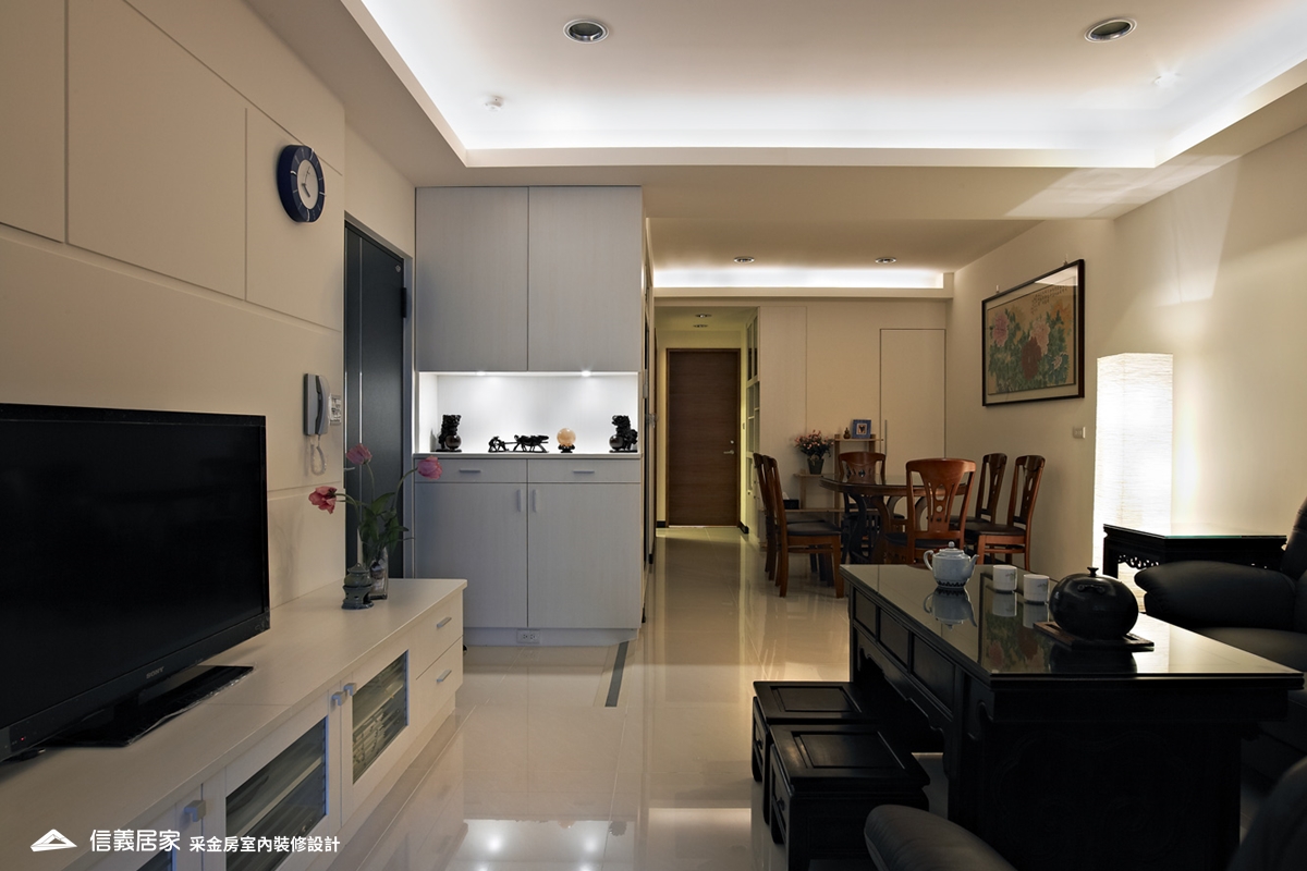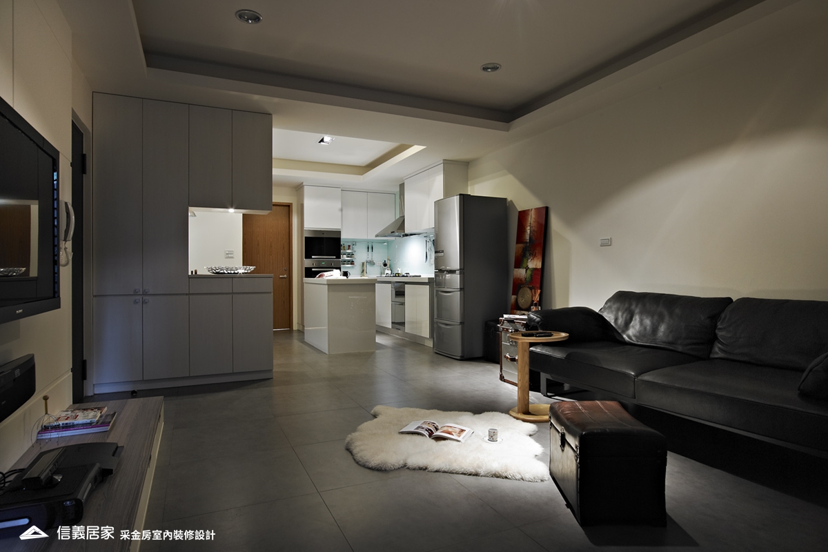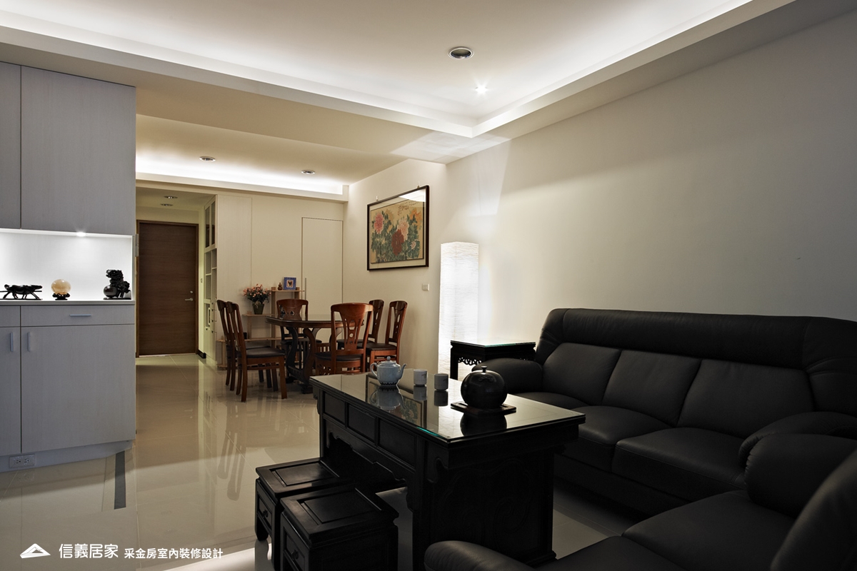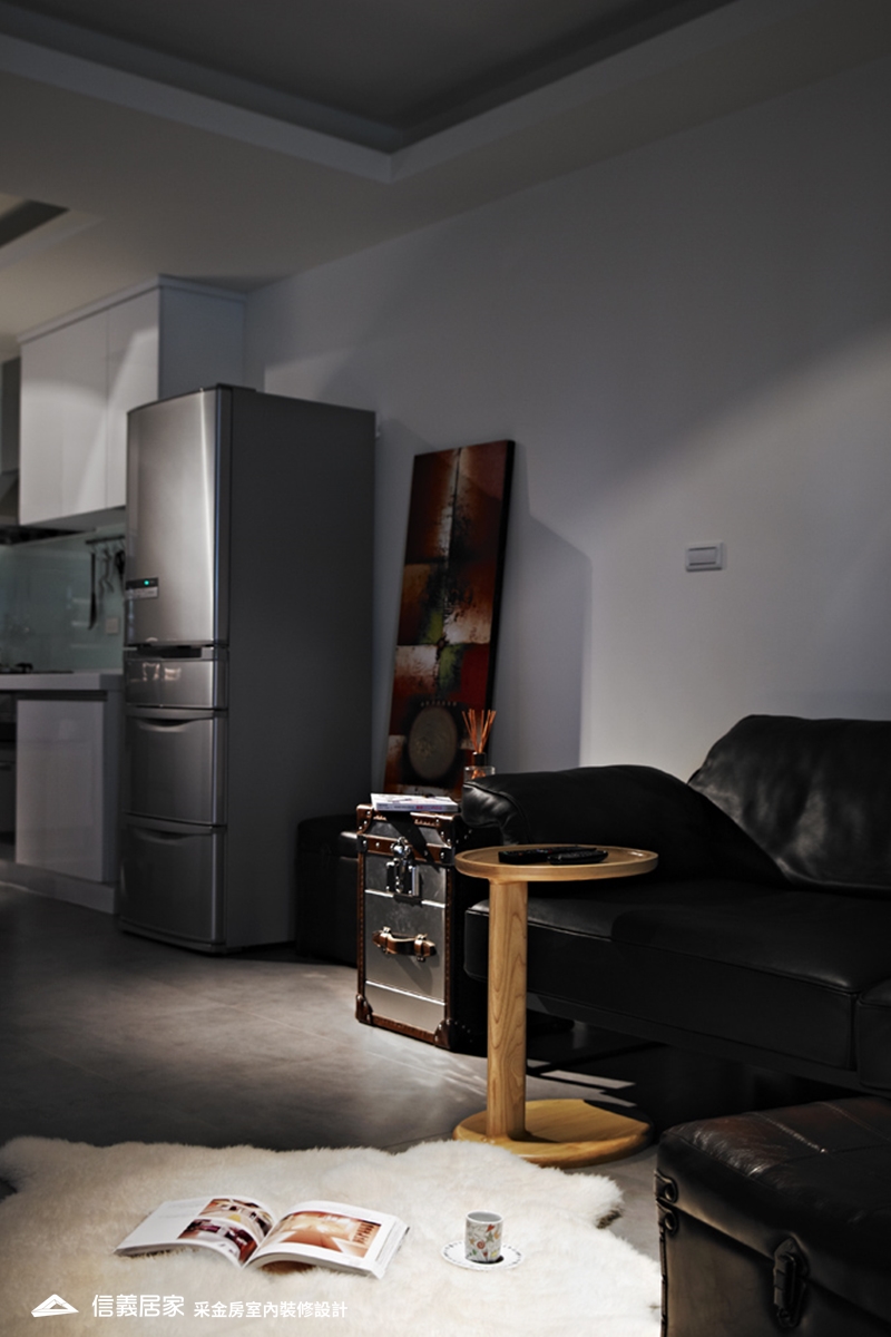 以系統櫃做為玄關和飯廳的場域劃分,除了可當鞋櫃、收納櫃外,鏤空的設計也能擺上屋主收藏的藝術品。另外,牛皮沙發和聚光燈創造出客廳低調奢華的氛圍。
