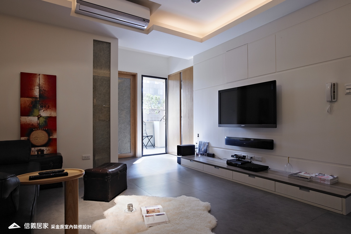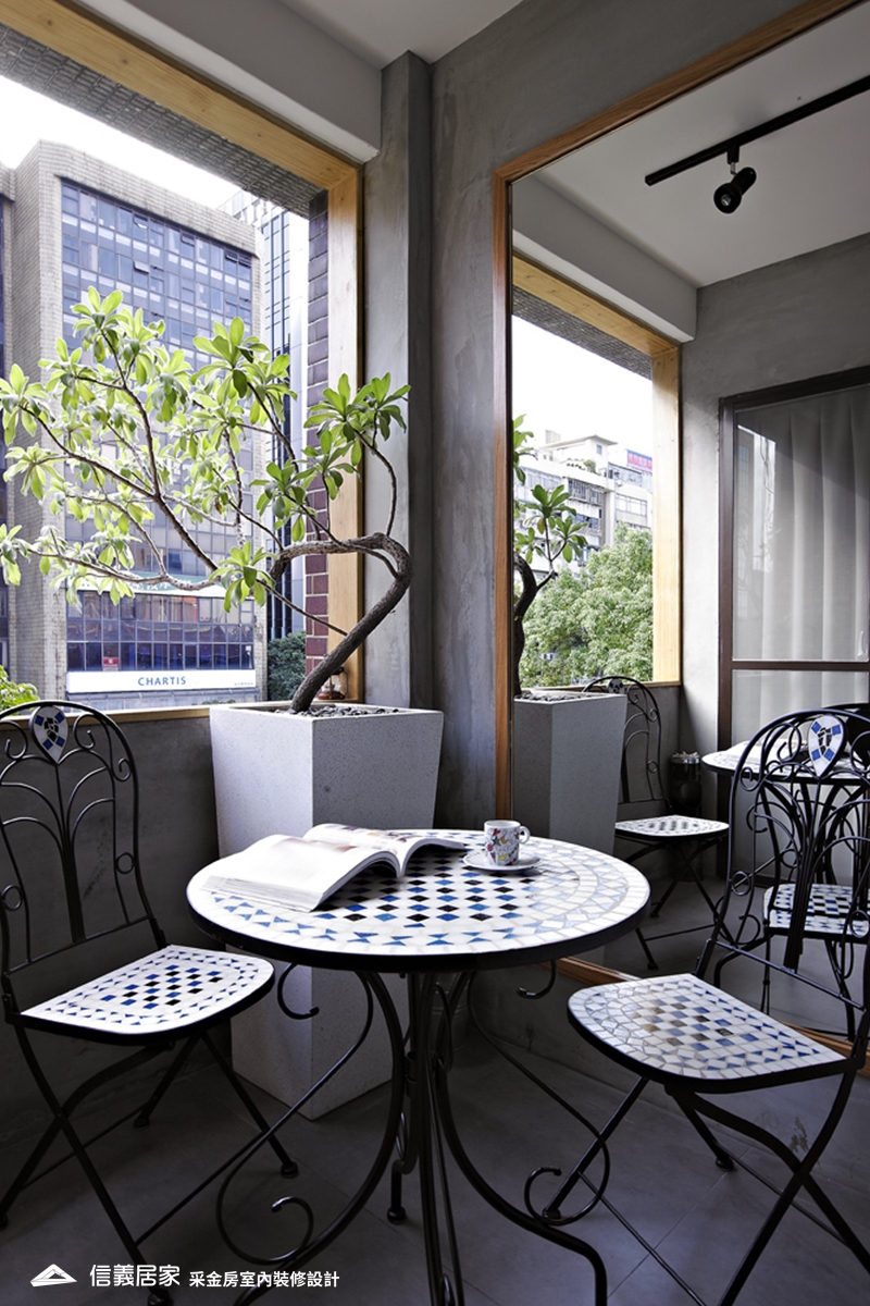 擁有一個對外陽台一直是屋主最大的願望,在本身公寓無陽台的情況下,如何一圓陽台夢呢?采金房利用公寓內的一間小房間,把空間內縮為一個陽台及儲藏空間,再將對外窗擴至半身高度並改成半露天式的場域;就這樣,一個既有綠意又能讓屋主放鬆休憩的陽台空間誕生了!