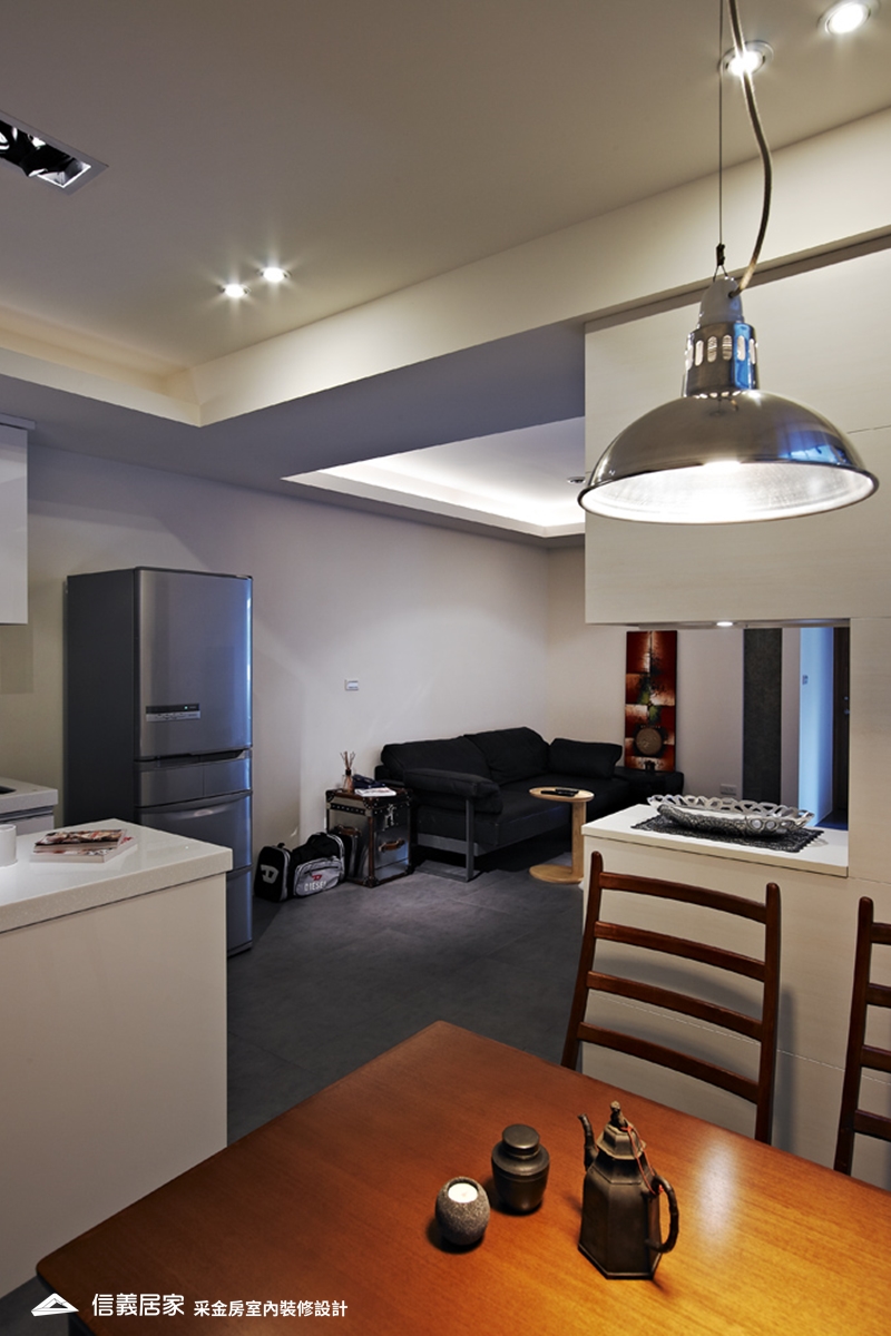 此樓層以仿石紋磚做為地板建材,採冷色系與搭配氣氛燈光,營造出不同於二樓的時尚簡約氛圍。屋主對家具挑選有獨到的風格與品味,也喜歡收集國外的骨董家飾;無論是飯廳的羊角餐桌或是在家中各角落的畫作、老舊皮箱與木酒桶等物件,都成為雕塑空間風格的重要元素。