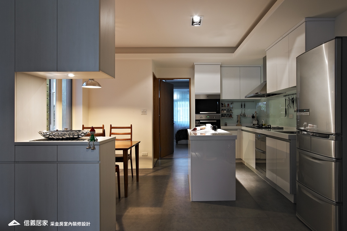 開放式的廚房空間也是屋主所期盼的,在飯廳與廚房間規劃中島櫃,不僅讓屋主在烹飪時有更多的檯面空間,更兼具收納、吧檯等多重機能;中島也切割出場域,使區域動線更加完美。
