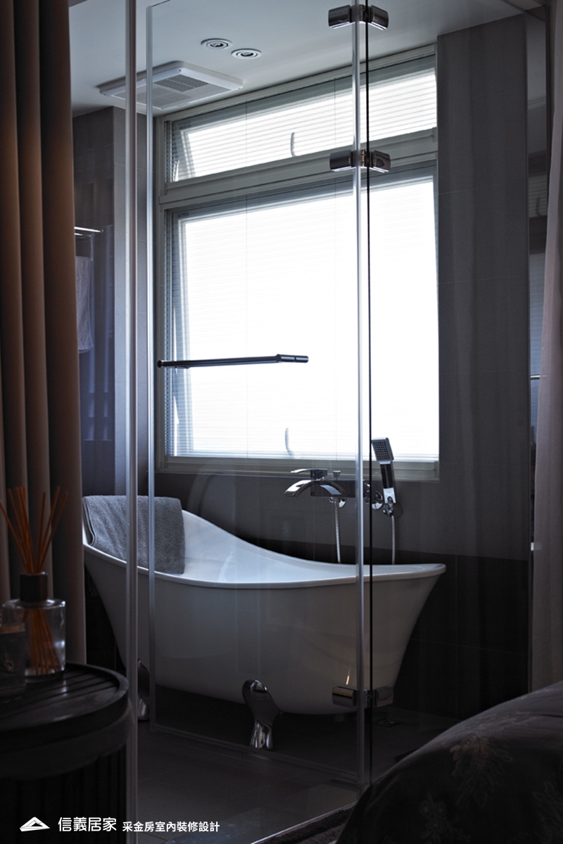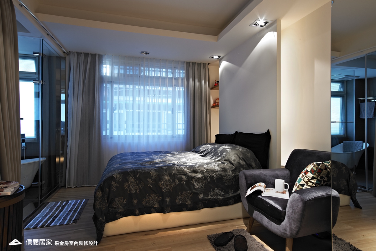 著重生活氣氛的屋主,在主臥室的規劃上減少固定牆面切割空間,利用玻璃、鏡子等元素放大視覺效果。因空間不大,利用穿透性的玻璃延長視覺效果;將衛浴空間的整片牆與門板都改為全透明的玻璃門,帶來入住精品飯店一般的體驗,想保有隱私時替落地玻璃拉上浴簾即可。