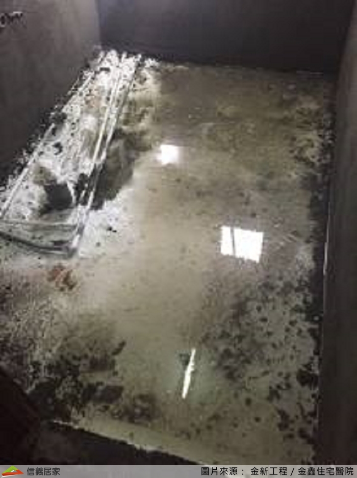 檢測:地面防水不良時,當樓上洗澡或清浴室,樓下的天花板會出現滲水情形。施作:將浴室地面敲除(需至少敲到壁面隅角一塊磁磚的位置)施作防水,使用的防水材與壁面防水使用的相同;防水施作完須放水試水,確定沒有滲漏後,再進行復原。地面防水施作時,另需注意地面施作後之高度、需較門檻防水層低,否則仍會由門檻滲水到浴室外面。