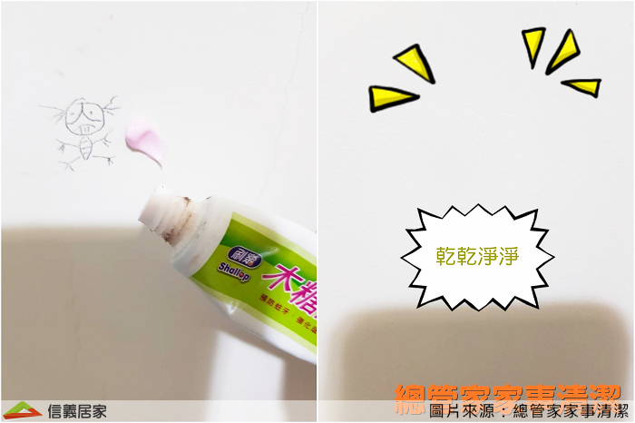 小朋友最喜歡趁大人不注意時、在牆上塗鴉即性創作;別擔心,將牙膏塗在擦手紙或白布上,再來回擦拭牆面即可輕鬆去除。