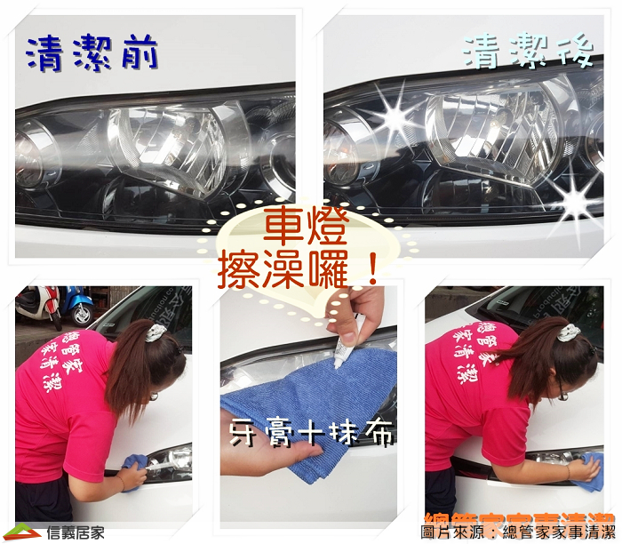 車子的頭燈在風吹日曬下,很容易就披著一層污垢;用牙膏、一塊布來回擦拭幾下,愛車的頭燈又會閃閃動人囉。