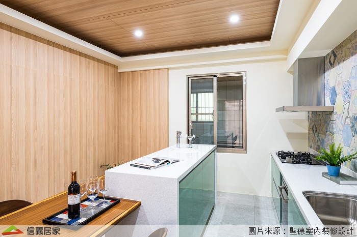 融合吧檯功能的中島櫃,一邊配著美食一邊話家常,為屋主一家日常交流感情不可或缺的場域。開放式一字型廚房最重收納空間,吧檯中島櫃完美解決收納問題,擴大實用性。