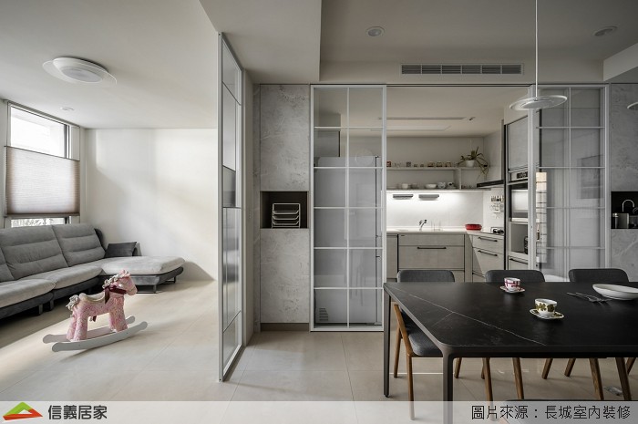 廚房以淺石紋櫃體為主色調,餐桌選用同材質增添質感,而全石紋餐廚不免給人過於沉重負擔之感。因此,設計師搭配灰藍系邊框的玻璃框拉門,提升透明感,兩者相得益彰,家的味道質樸又深刻。