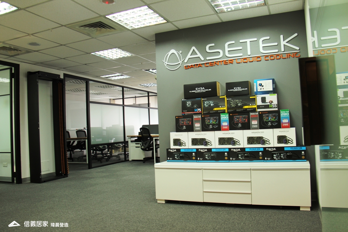 主題牆以深灰色為底搭配純白壓克力字體,造價較低但效果十足,減少固定式的展架,節省裝修經費、並把視覺的重點放在公司的產品上,讓產品變成空間的裝飾品。公區域為產品展示空間,為讓產品聚焦,因此不多做其它裝飾。