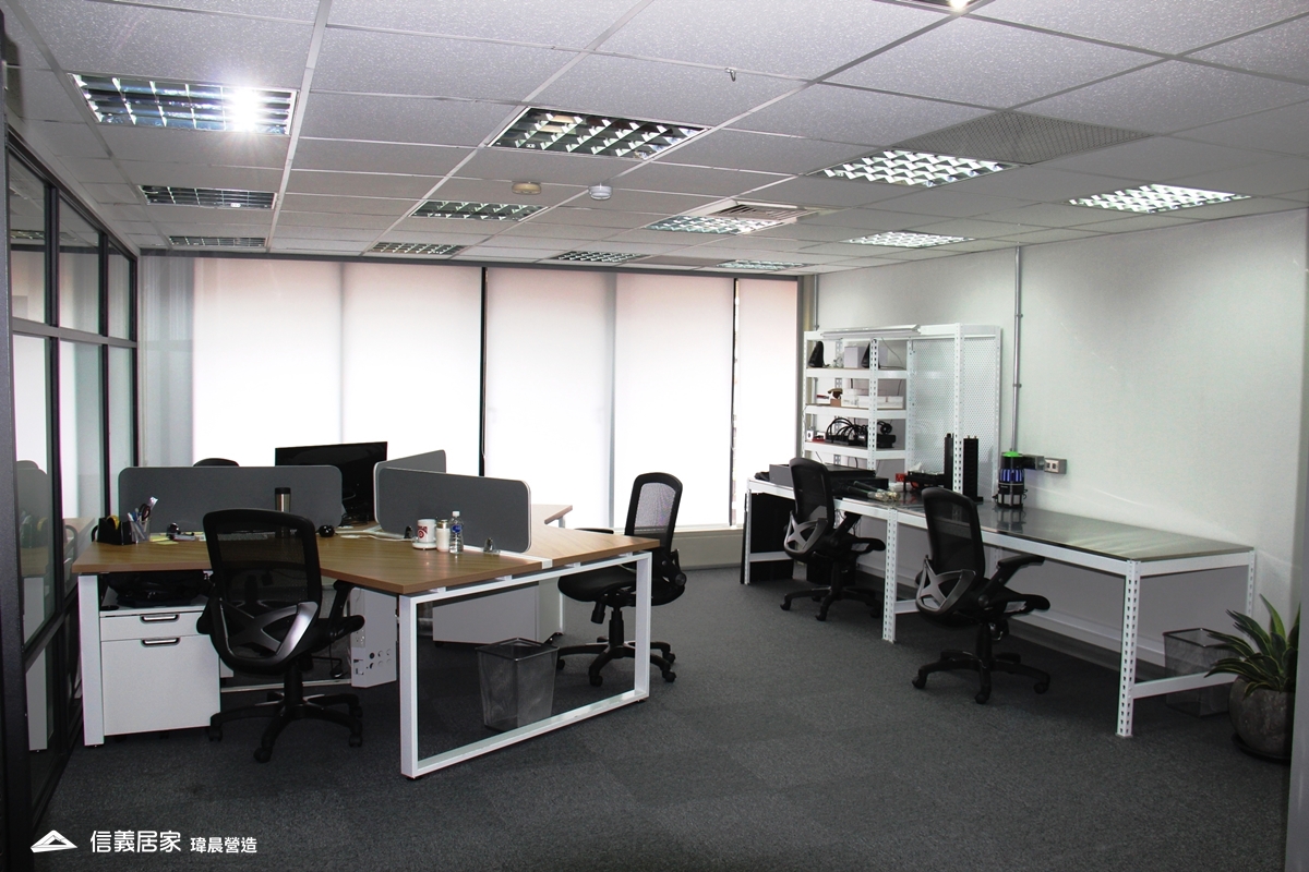 傳統的OA辦公家具的外觀都比較呆板,格屏的高度也較高容易遮蔽視線。業主希望讓辦公環境看起來活潑,所以選用新式的三人工作站,工作桌面成圓形排列但使用面積不變,有效利用室內空間。另外降低隔屏高度,同事間溝通更容易。主要辦公區域採用開放式的配置,在辦公區旁的是簡易維修區,負責不同工作的兩組人可立即地互動討論。