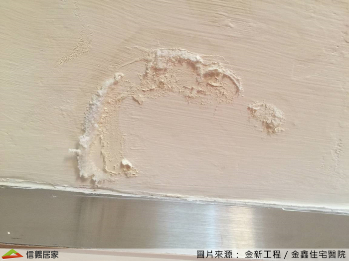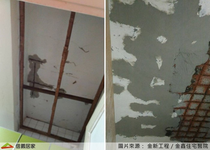 樓板的滲水有時會造成鋼筋鏽蝕,進而導致天花水泥剝落,即俗稱的「鋼筋外露」。天花水泥剝落不僅不美觀,更可能造成砸傷的危險,需小心處理。鋼筋外露的處理方式為:先將已剝落及快剝落的水泥敲除,再用鋼刷刷除鋼筋鏽蝕的表面,並噴上紅丹漆防鏽,最後再使用Epoxy配合輕質水泥將天花抹平。