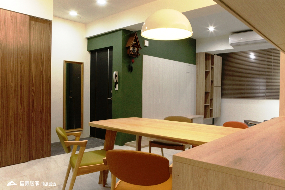陳老師與家人熱愛戶外運動,一直希望新家能以大地色為主體,不需要過多的擦脂抹粉,機能性以收納為主。於是我們用代表綠葉的深綠色作為電視主牆的基底,搭配上深淺木紋的收納櫃增加實用性。