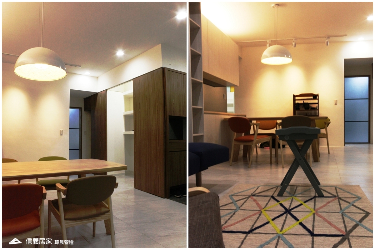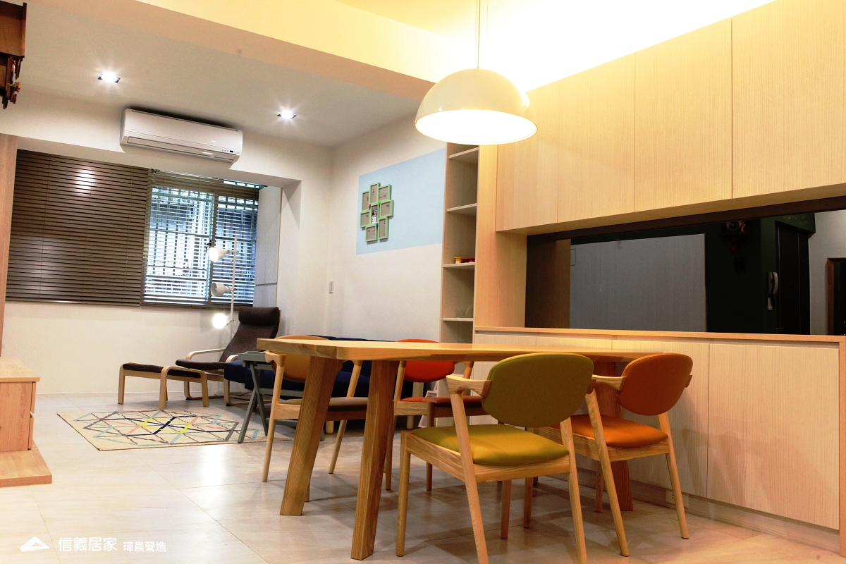 背牆的部分同樣以淺色木紋為主,象徵天空的淡藍色框框、貼的是一家人出遊的照片。全家人一起看書談天說地的餐桌,是陳老師鍾愛的實木大桌,兼具工作和用餐的功能;餐椅跟地毯特意選用不同的顏色,讓視覺更為顯活潑。