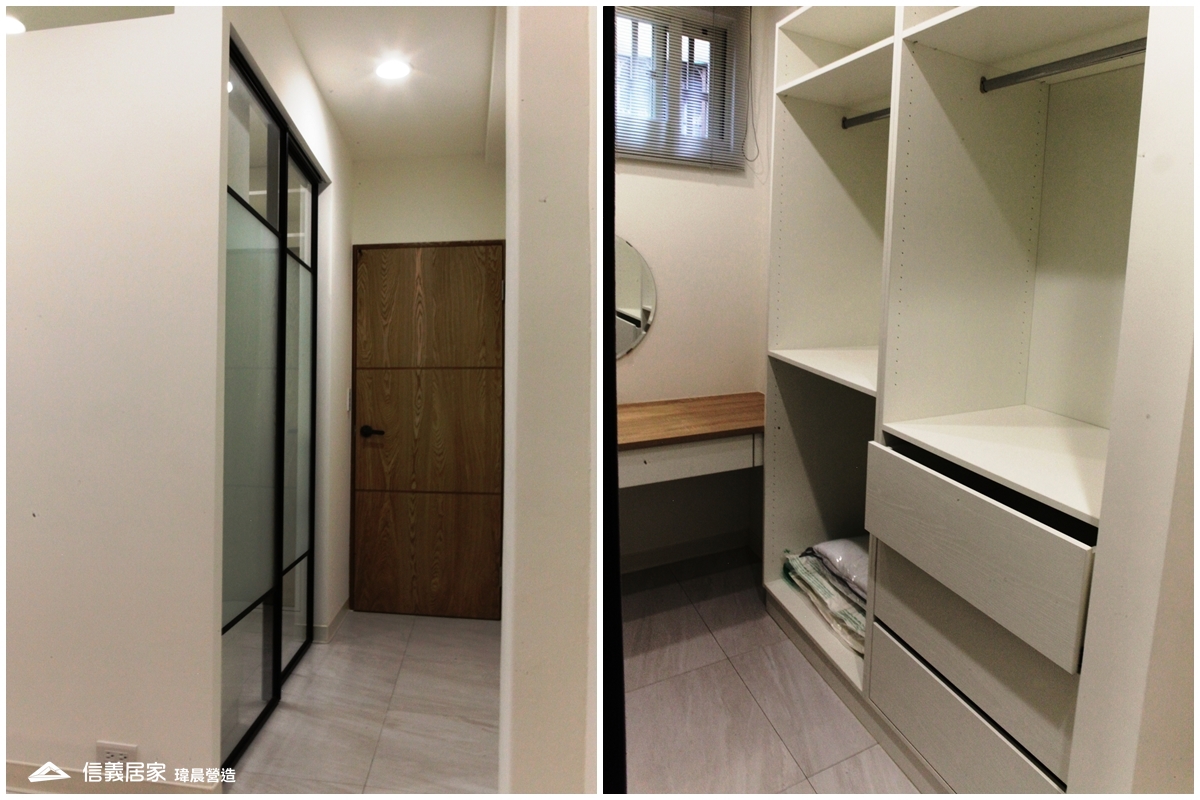 主臥室配置了更衣室,讓空間利用更完整;透光的玻璃滑門及牆上的清玻璃,增加採光及穿透感。