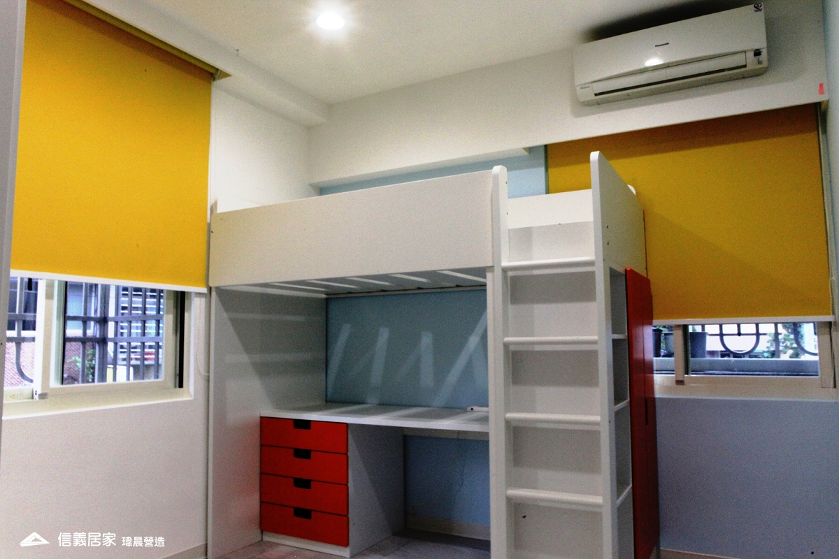 陳小弟喜歡色彩鮮艷的家具,一起逛過幾次IKEA後、選擇了一組淺橘色的上下鋪,搭配天藍色牆面跟鮮黃色捲簾,這是屬於陳小弟的秘密基地。