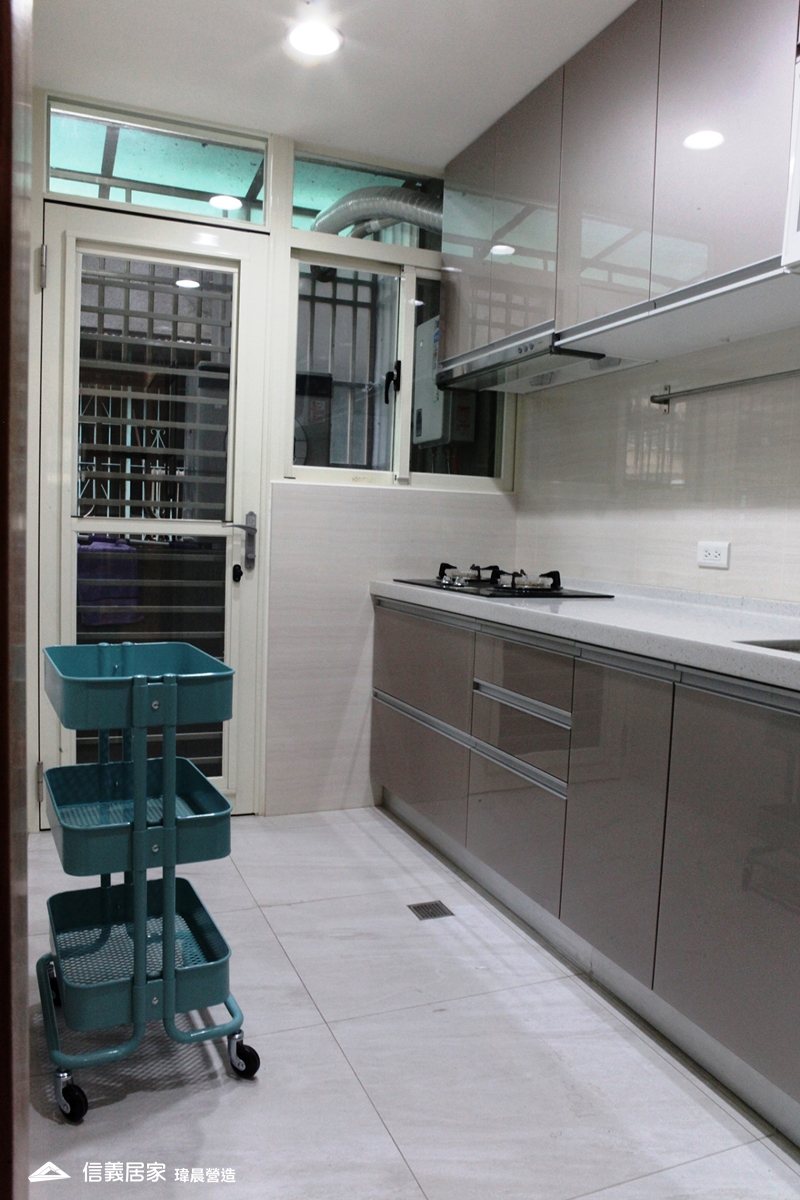 廚房是女主人的戰場。師母喜歡明亮的感覺,淺色釉面磚好看好清潔,紫藕色廚具門片搭配白色人造石,穩重又帶點俏皮。畫龍點睛的藍色餐車讓畫面更豐富,每個空間依照不同的需求,各自展現不一樣的感覺。