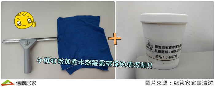 秘訣►►將小蘇打粉用水稀釋、再將抹布浸泡其中,將濕抹布擰乾一點後、覆蓋在刮刀上後使用,就可以輕鬆去除玻璃髒汙、環保又不傷手。