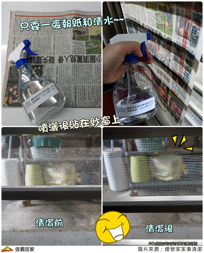 秘訣►►只要準備報紙+水,將報紙靠在紗窗上噴水讓它濕透、靜置五分鐘後撕除,即可將大部分的灰塵黏下來。