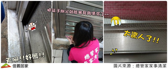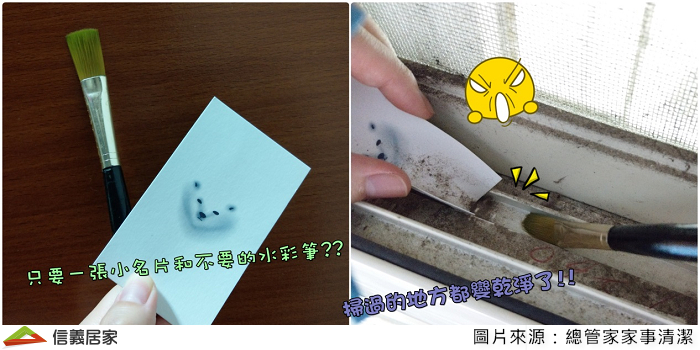 秘訣►►死角先用削尖的筷子或鉛筆,將灰塵撈出來。再準備一張名片,將它折成貼合窗軌的大小,然後拿出不要的化妝刷、牙刷、烤肉刷,先掃再擦,更乾淨。