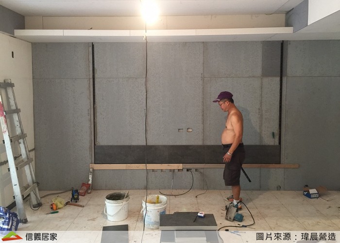 泥作師傅施作最重要的電視牆,完工後的感覺跟先前完全不同了。