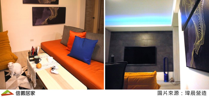 能雙面使用的進口沙發、顏色活潑又極具功能性,特別的造型更為空間增添個性。