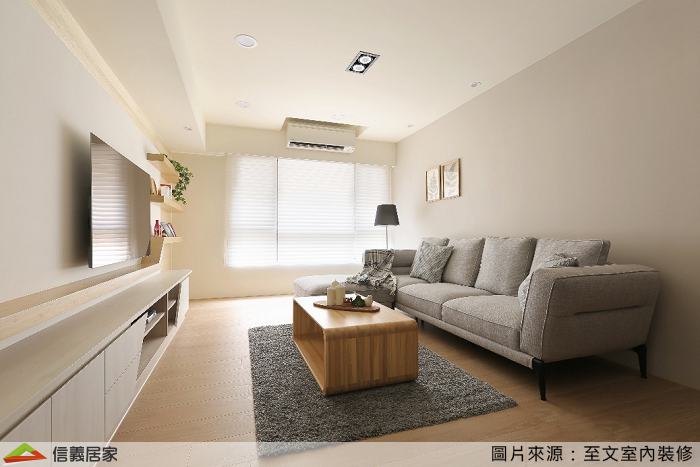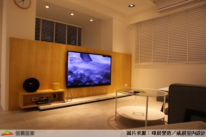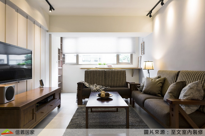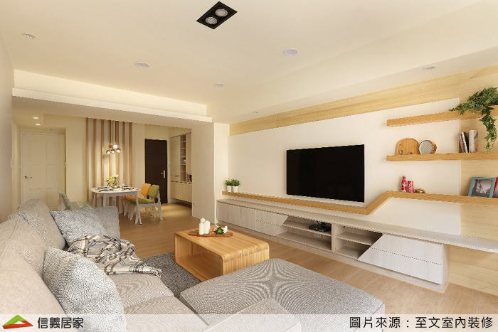 保有北歐風線條簡單、用色清爽的特性,在電視主牆用打板做一些視覺上的變化,色彩以白色、及大地色系為主,讓原有的柚木家具可以和諧佇立其中。