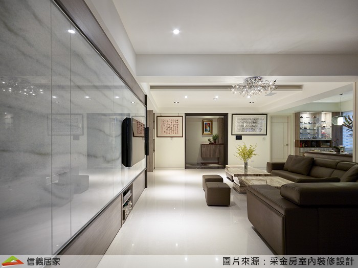 ▲電視牆則以大理石牆面從公共場域延伸至私密空間;一方面做動線引導,另一方面透過文化石的粗獷與大理石的精緻光滑,紅色與白色,以對比手法營造出大器空間的質感。