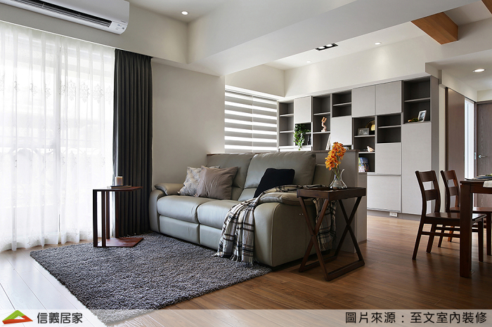 3房2廳的中古屋經過改造,彷彿如新成屋亮麗;設計師運用不同明暗度的灰色搭配木紋質感,展現低調簡約的氛圍,讓家的質感瞬升。(圖文提供/采金房室內裝修設計)