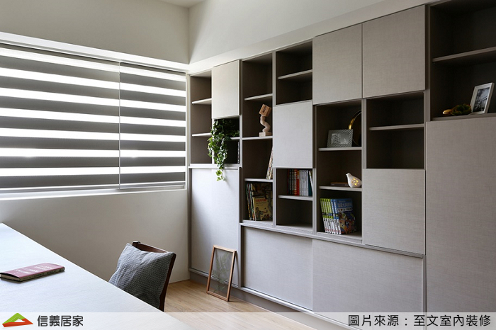 小而巧的開放式書房,白色系列造型櫃體,搭配象牙白加寬百頁簾,體現開放式書房的靈活機能性。以白色作為大量藏書收納櫃的主色,減少大面積櫃體的壓迫感。加上淺色木地板,成為放鬆又淡雅的私人休憩空間。(圖文提供/至文室內裝修)