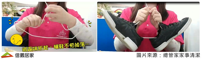 不用特地花錢買曬鞋架,只要將衣架兩端向上折起就搞定囉!將鞋子套入兩側,怎麼甩都不會掉。