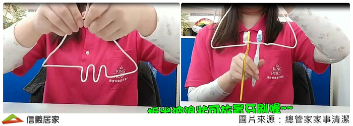 牙刷放在漱口杯,久了以後杯底容易堆積汙垢;雖然市面上有許多牙刷置物架、甚至是牙刷消毒機,其實只要保持良好的通風就夠了。不妨利用衣架做牙刷吊掛架,先將衣架摺出波浪狀後,再調整方向即可。