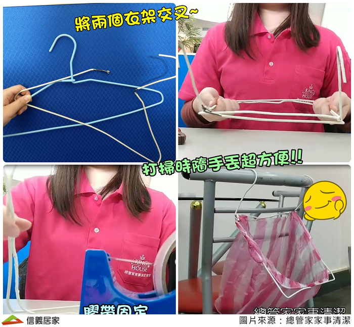 常有人把塑膠袋掛在門把上當垃圾桶,但容易飛掉又不方便單手將垃圾倒入。將兩個衣架交叉,即可成為簡易垃圾桶,方便隨手掛、隨手丟,戶外露營也很適合。