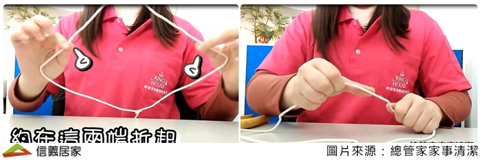 隨手要用的衣架沒地方放、總是擱置在晾衣架上嗎?不防拿出一個衣架,將下方拉成四方形後、再將最下角往上折疊,盡量摺出一個可以掛放東西的弧度,就可以放置衣架囉!